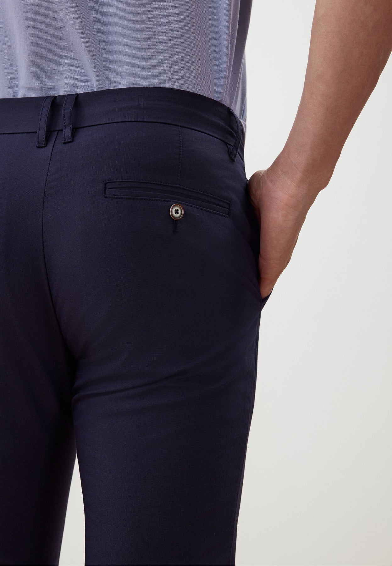 - Slanted front pockets, Double welt pockets with button closure
